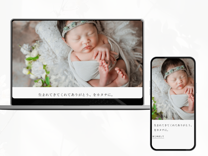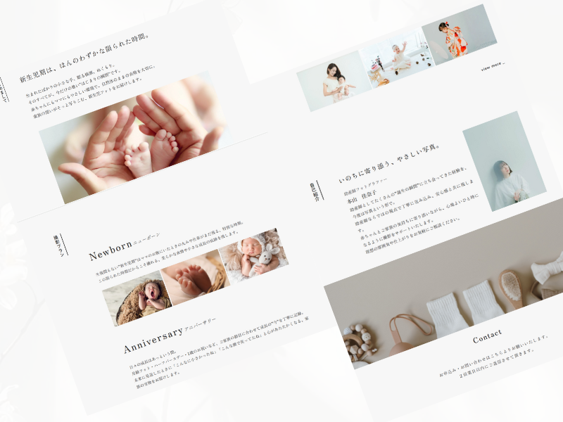 元助産師としての安心感と、赤ちゃんへのやさしい眼差しを丁寧に伝えるホームページを制作しました。やわらかい色合いと余白を活かし、ぬくもりが自然と感じられる世界観に。助産師としての経験があるからこそ届けられる"安心して任せられる撮影"という強みを、言葉とデザインの両方から表現しました。